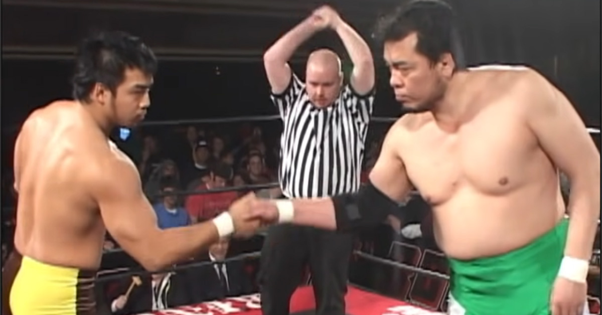 三沢の持ってるGHCヘビー級選手権試合で、なんとジョー樋口が日本語で選手権宣言。