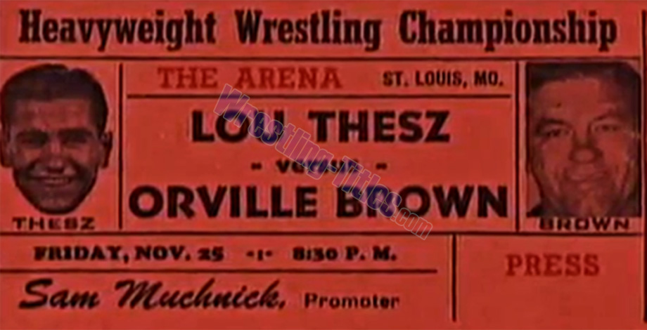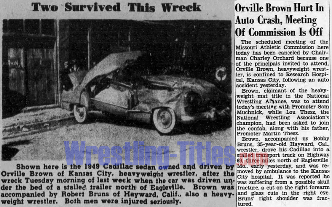 ヘビー級王座統一戦が近づいていた10月31日、アイオワ州デモインでボビー・ブランズを相手に60分時間切れ引き分けでアライアンス王座を防衛したオービル・ブラウンは、試合後の真夜中、対戦相手のブランズと共に車でカンザスシティに戻る途中、デモインとカンザスシティの中間あたりで交通事故に遭い重傷を負う。当時はまだ抗争中の選手同士が公で行動を共にするというのはありえない時代だったので、物議をかもす結果となった。ブラウンは4日後に意識を取り戻すがテーズとの統一戦は中止。