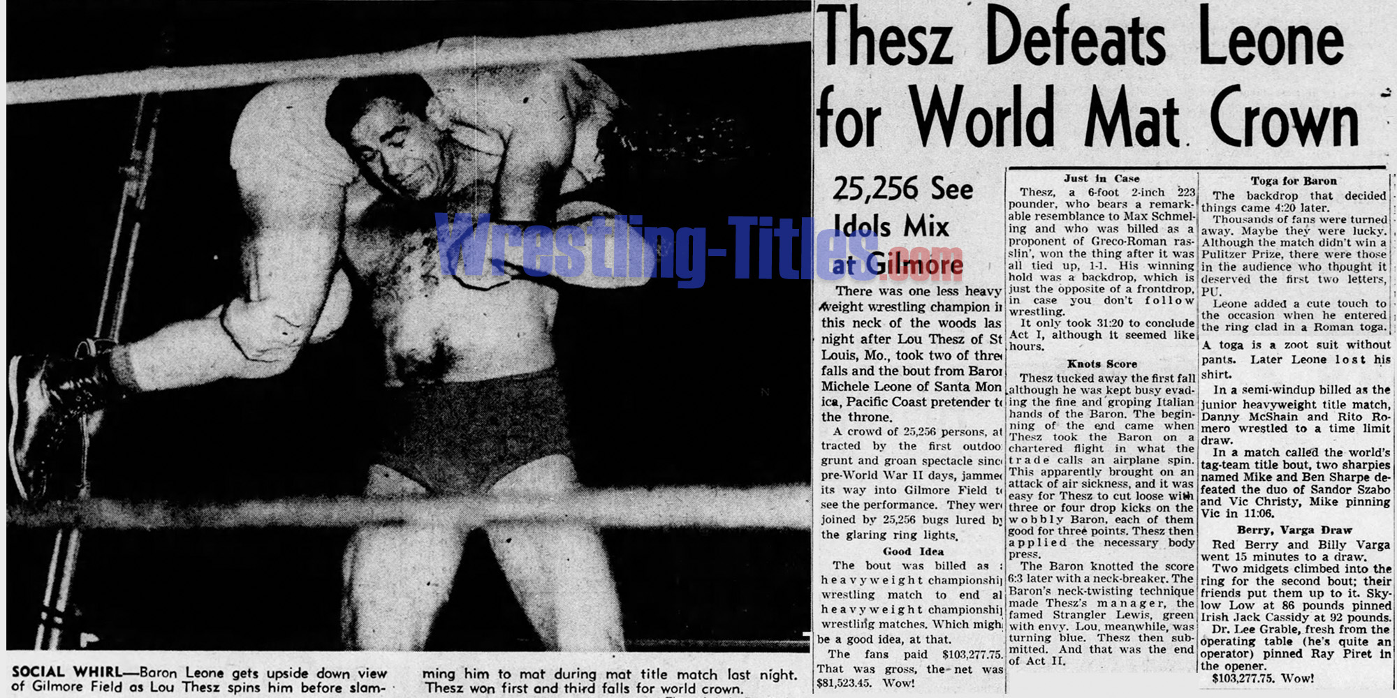 ロサンゼルスでは1952年5月21日、ハリウッドのギルモア・フィールドで現地版世界王者バロン・ミシェル・レオーニがアライアンス王者ルー・テーズと対戦し、テーズが王座統一を果たした。