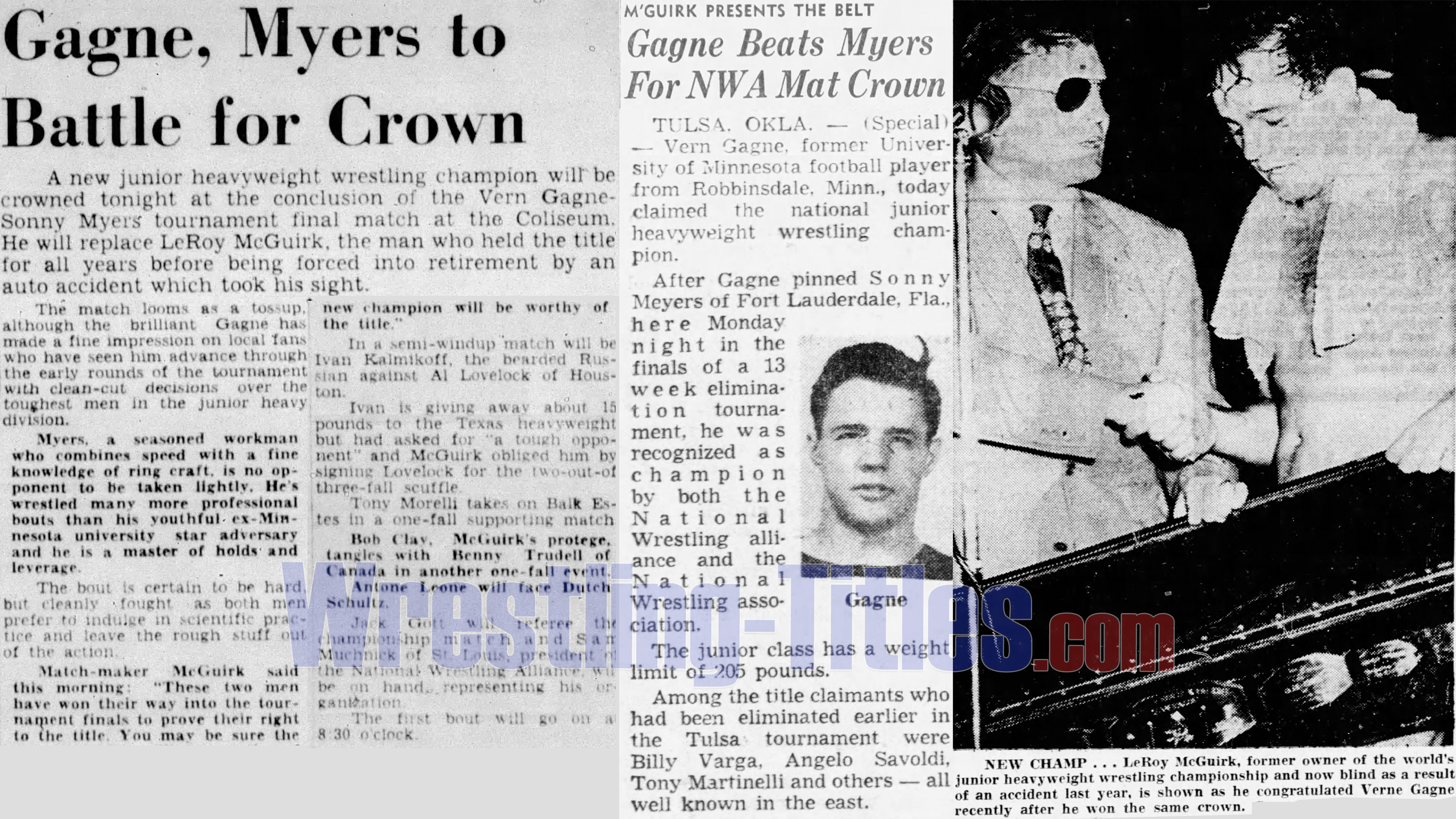 だがその約1ヶ月後の1950年2月7日アーカンソー州リトルロックで、マクガークも自動車事故に遭う。既にこどもの頃片目の視力を失っていたマクガークは不幸にもこの事故で見えていた方の目を負傷し、盲目になってしまう。マクガークの引退により世界ジュニアヘビー級王座は空位となった。